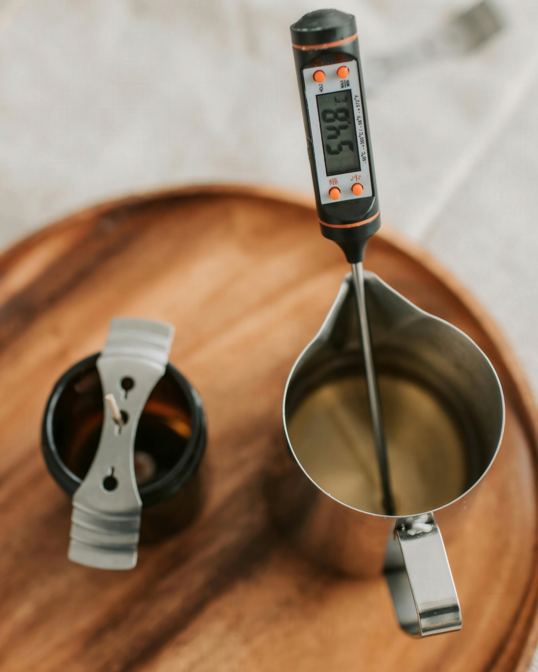 Smelt de was au bain-marie zodat deze geleidelijk verwarmt en niet te heet wordt. Roer af en toe rustig door om de temperatuur gelijkmatig te houden en klontjes te voorkomen. Of gebruik een smeltketel of smeltkan! Te snel smelten kan leiden tot een korrelig oppervlak na het uitharden. Werk bij voorkeur met een thermometer zodat je maximale controle hebt over het proces.