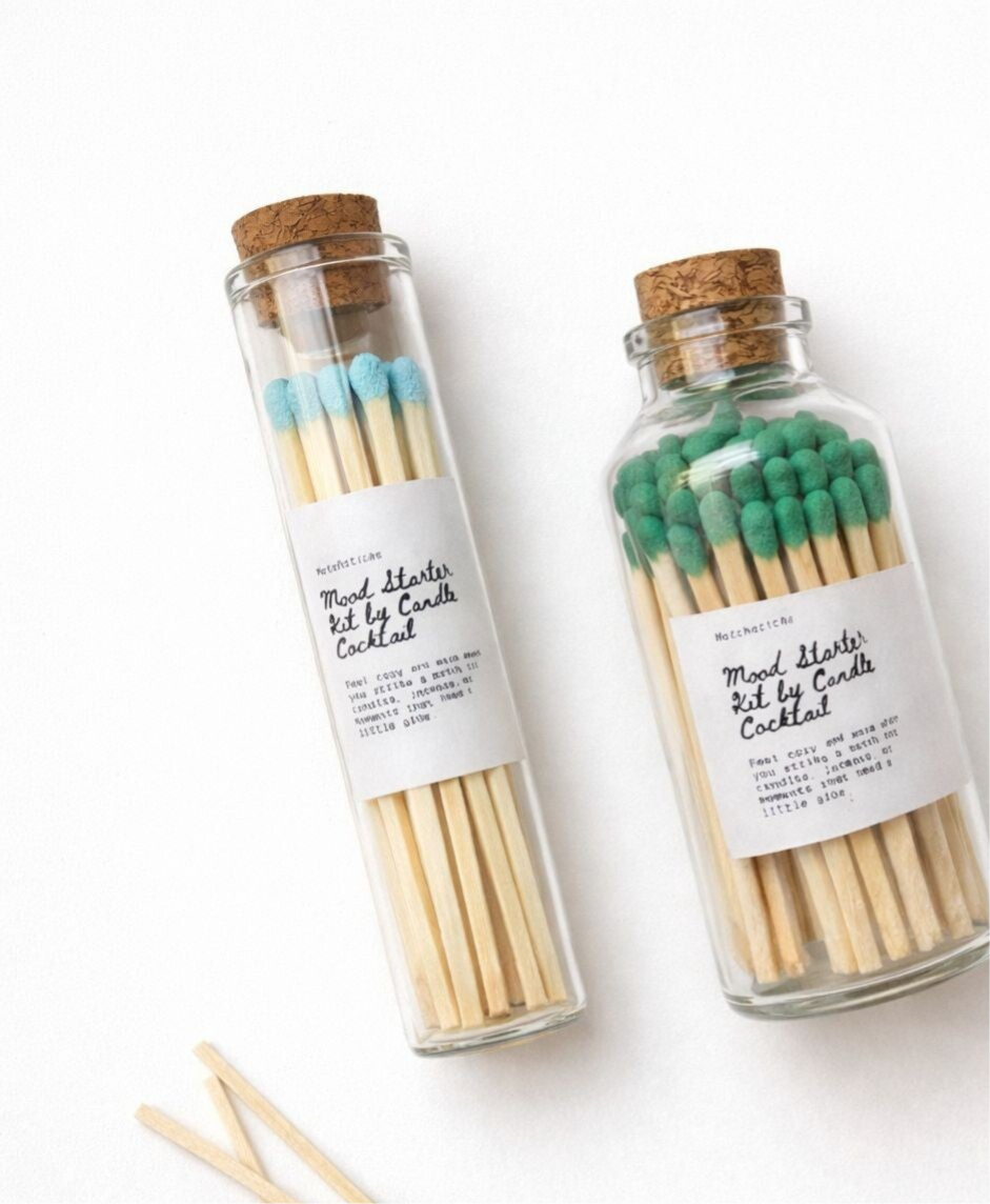De 60 houten lucifers met opvallende gekleurde kop geven elk kaarsmoment nét dat beetje extra charme. Ideaal voor het aansteken van kaarsen, wierook of om een ontspannen avond compleet te maken. Dankzij de elegante glazen koker met kurken dop blijven de lucifers netjes bewaard én staan ze prachtig op tafel, in de badkamer of naast je favoriete geurkaars.